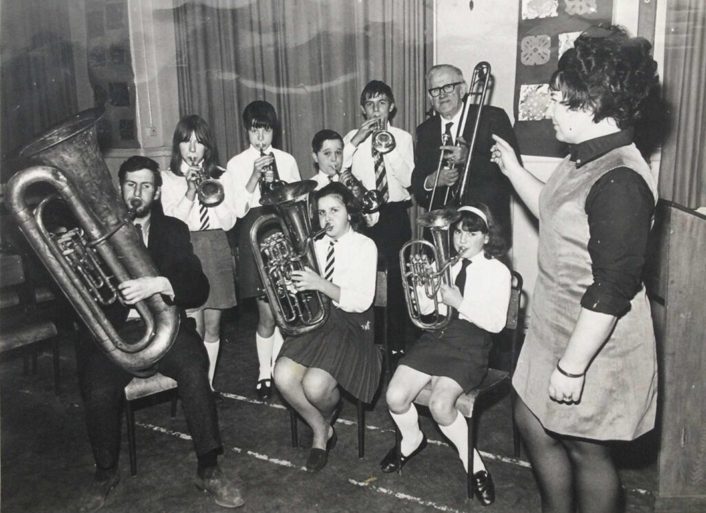 This photo was taken December 1968, the first year that Great Wyrley High School formed a brass band. Rehearse took place in the school hall with ex-Yorkshire miner Jim Sharp on trombone. Music teacher Margaret Howell poses with a baton, using mainly donated instruments. Old Jim Sharp – trombone, Andrew Perks – cornet, Valerie Love – cornet. Georgina Onions – euphonium. Tim Perks – cornet. Rosemary Wiznieski on tenor horn and Terry McGrath on tuba.