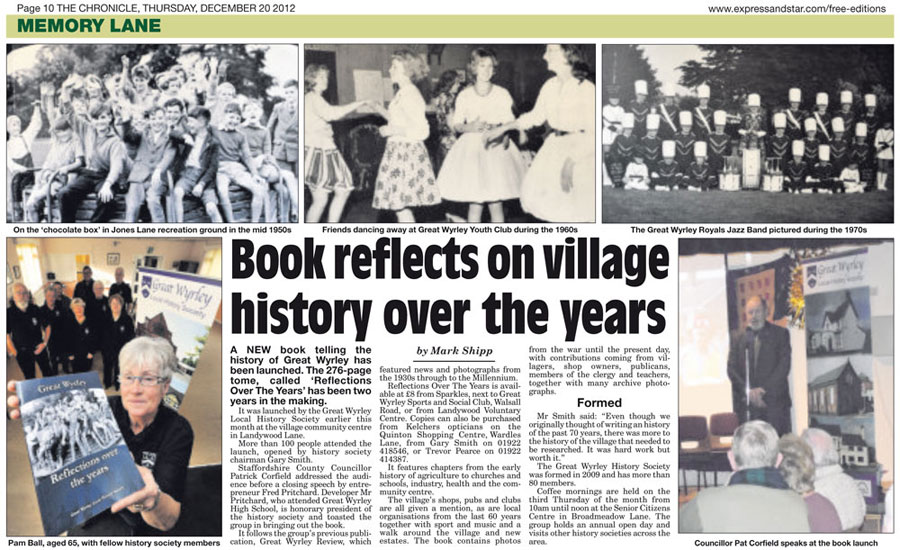 More than 100 people joined us on December 12th 2012 at the Community Centre to celebrate the launch of our book ‘Great Wyrley Reflections Over The Years’. It was a pleasure to celebrate the result of three years hard work and research from numerous people with colleagues, friends and members of the community. Thanks to the support of the Heritage Lottery Fund, we have been able to produce 240 pages of reflections of the changing faces of our community.